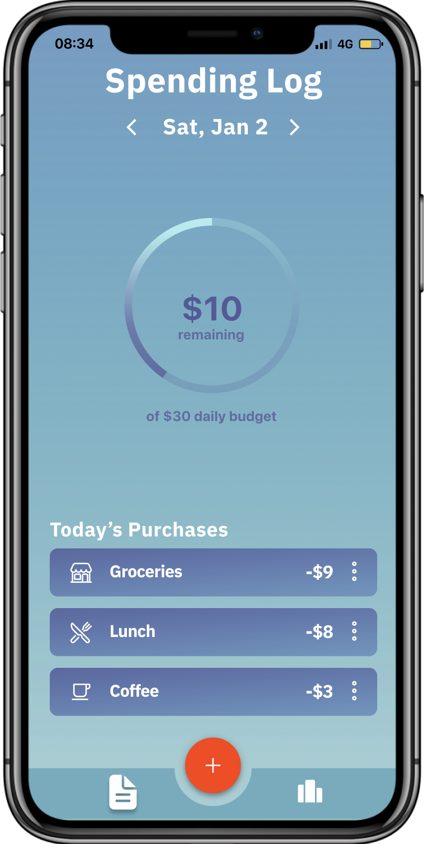 Set your daily food budget, log every food expense, and let any unspent funds carry over to the next day